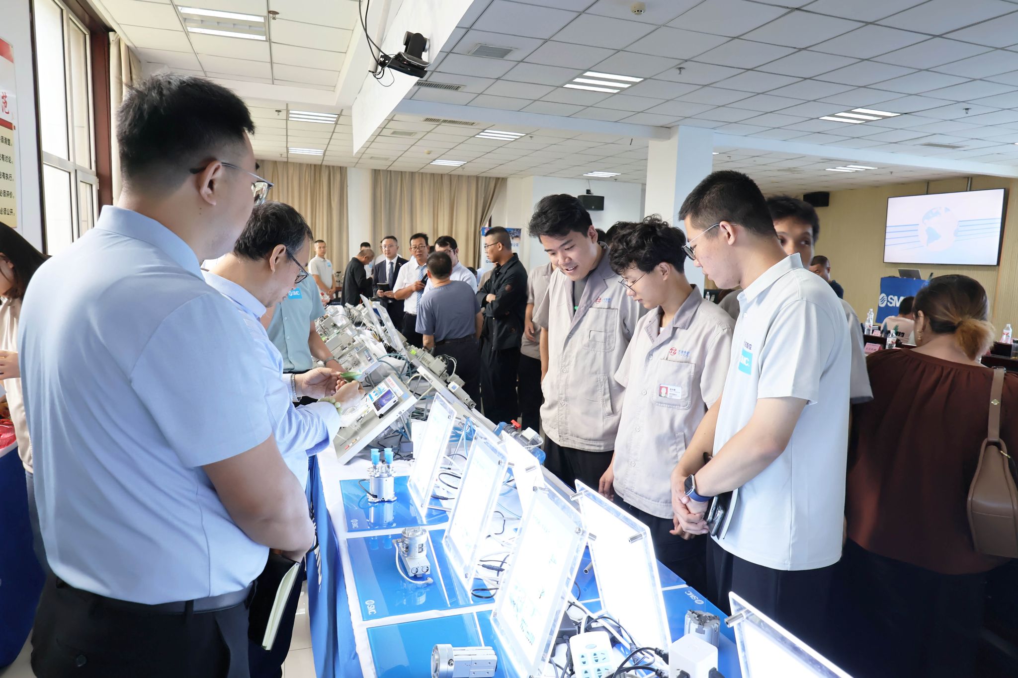 在实物展示与互动交流环节,参会者围绕展品结构与SMC技术专家展开热烈讨论,针对实际生产中遇到的技术难题、应用痛点进行了深入探讨,此外,参会人员还与联盟同行、高校学者就行业技术发展趋势、人才培养体系建设、项目合作等进行良好沟通,为晋中纺机液压特色专业镇构建技术生态注入了新动能。交流会虽已落幕,技术热度却持续升温。不少未能参会的企业技术人员、生产一线职工专程前来观摩展品,交流经验。大家一致认为,本次交流会不仅拓宽了对气动与液压系统融合应用的认知边界,也更清晰揭示当前企业自身在产品能效、智能化程度及系统解决方案等方面与国际先进水平之间的差距,同时也看到了追赶和超越的机遇。