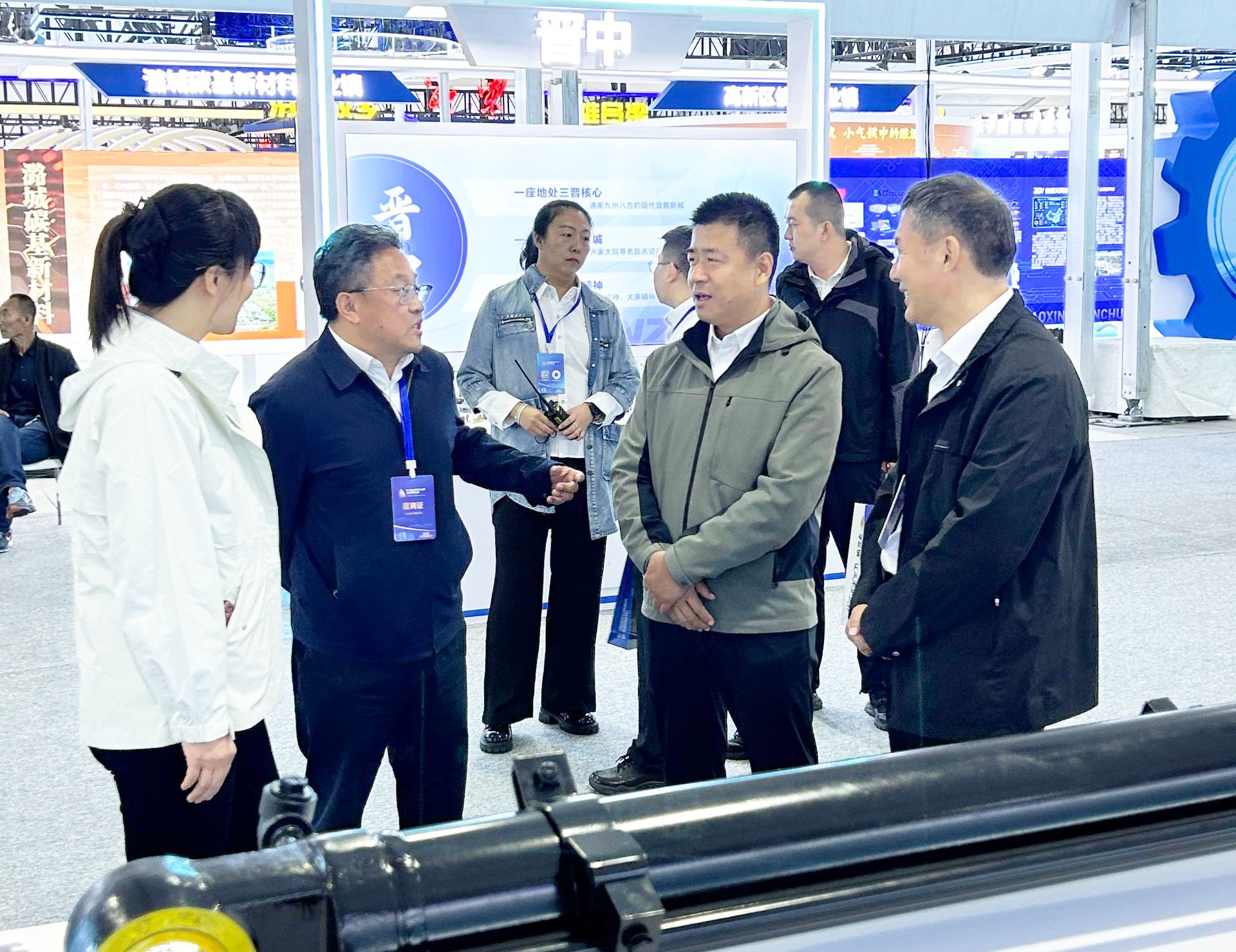 作为晋中纺机液压专业镇的龙头企业,太重榆液以全系列、高规格亮相,展出液压油缸、回转马达、行走马达、轴向柱塞泵、整体多路阀、比例阀等一系列核心元件,以及挖掘机、叉车、高机、汽车起重机等系统成套解决方案,全面展现从零部件到整机装备的技术整合能力。展会期间,晋中市政府党组成员、副市长王帮富,晋中市工业和信息化局党委书记、局长张建岗,示范区晋中开发区汇通产业园主任王丽萍亲临展台,对“中国液压摇篮”的行业地位及国企使命担当给予高度肯定。